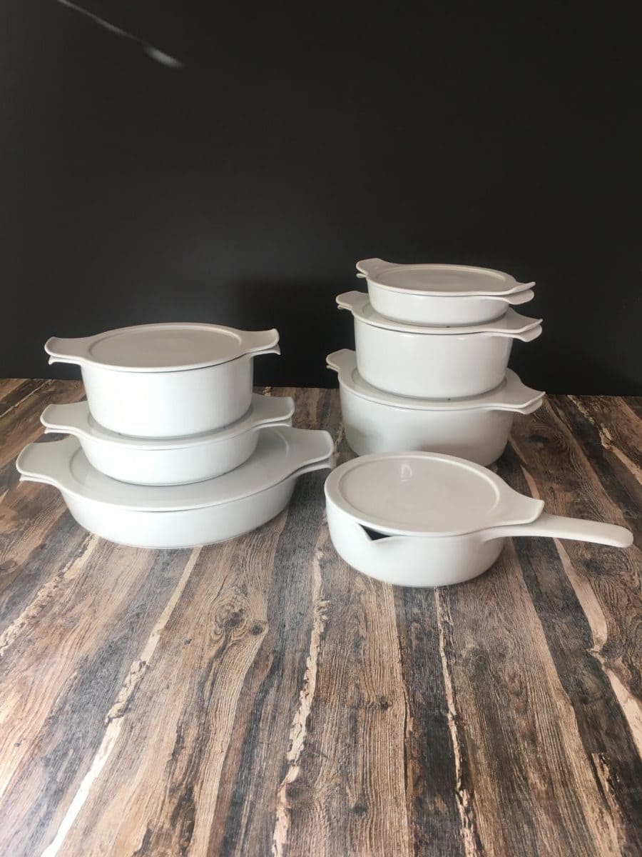 Die Porzellankochtöpfe gibt es in vier Größen, die Schalen in drei Größen und die Kasserolle in einer. Somit ergibt sich ein Füllvolumen von 300ml bis zu 4000ml. Jede Form hat einen passenden Deckel. Wer es schlicht mag würde sich sicher für die weiße Variante entscheiden. Darüber hinaus gibt es sieben weitere farbenfrohe Varianten. So können Sie individuell nach Ihnen Bedürfnissen kombinieren.